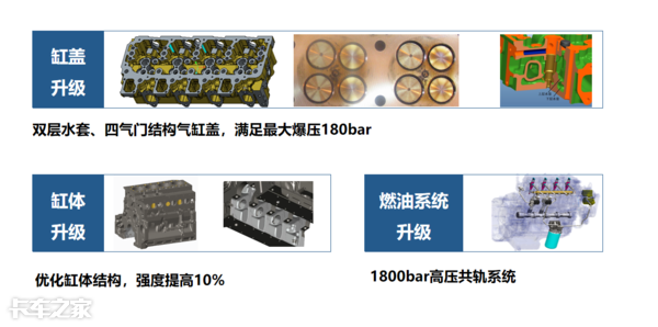 新4DH在技术结构上将缸盖升级为双层水套、四气门结构缸盖,并且在缸体结构上也进行了强度优化,在强度上相比前鉴产品提高10%;在传动方面应用的是多携带传动,这样的好处是可以使噪音大幅度降低,以减少车内分贝指数,从而提高舒适性。同时为了响应国家蓝天保卫战的号召,在后处理技术路线上采用了EGR+DOC+DPF+SCR+ASC+高压共轨技术。
