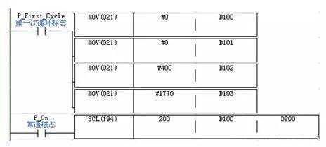 在执行SCL指令前先用MOV指令对DM0-DM3里分别赋值0,0,100,1770。之后SCL指令就能把输入的模拟量值定标成0-100的距离值了。