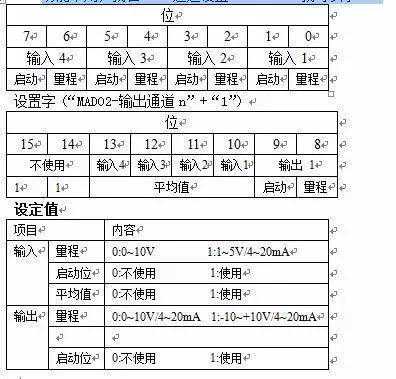 在n+1通道(n为分配给CPU单元或前一个扩展单元的最后一个输出通道)的每个位对应的作用按照如下表分配,在量程对应的位是设定输入输出的量程范围,在启动位和平均值对应的位是设定该功能使用与否,例如4路输入1路输出全用4-20ma,平均值功能不用,就在N+1通道设置C3FFHEX就可以了。