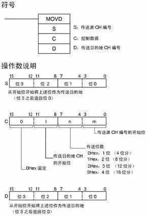 操作数排列如图1,S是源字,也就是用模拟量输入的通道,DI是指定数位号,每个数字指定方式如上图2,也就是指定从源字中哪一个数字开始传送(一个通道是4个16进制数字,一路输入是半个通道,也就是2个16进制数字),传送几个数字,传送到目标通道的哪个数字,D就是指定目标通道。例如现在MAD02的第一第二路输入的通道是002通道,现在要把第一路数据传送到DM0,第二路数据传送到DM1,MOVD指令