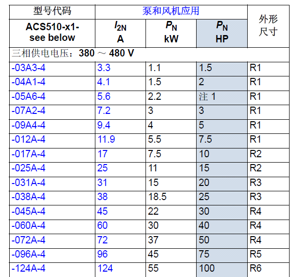例如:7.5kw的风机选型型号就是:ACS510-01-017A-4,其中017A为最大电流17A,实际电流参数按照电机名牌功率填写。