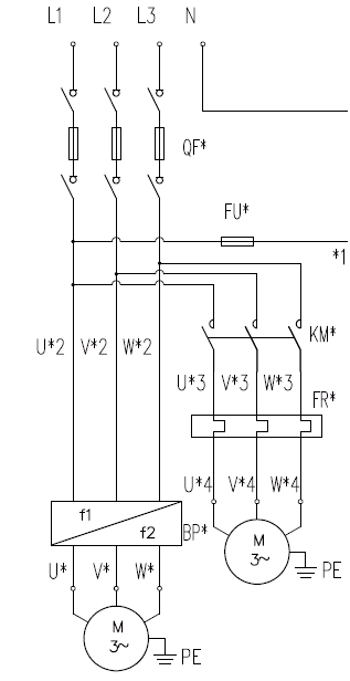 1,主电路设计,如图,L1、L2、L3、N为电源进线,QF为熔断隔离器,BP为变频器,出电缆直接接电机(距离远时加装出现电抗器),右侧KM为变频电机冷却风扇控制接触器。