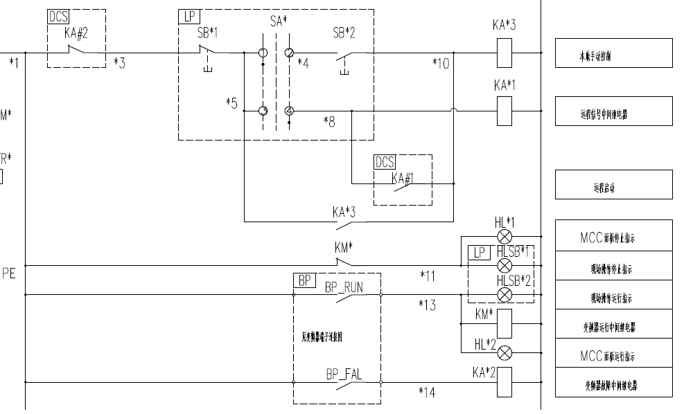 2,控制电路设计,如图,虚线框DCS为远程控制,LP为就地操作柱,BP为变频器,此电路设计为无扰切换远程和就地,KA1为DCS控制启动,SB1为操作柱控制停止,SB2为操作柱控制启动,KA*1为远程控制信号继电器,设置继电器是为了防止AC220V控制线和DC24信号线施工出错,造成DCS模块传入强电烧毁。