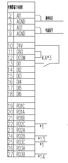 1403(继电器3输出)=4(故障-变频器故障时继电器动作,对应端子接线图RO3)
