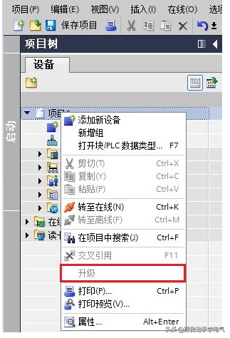 鼠标选中项目,右键选项“升级”显示为灰色。