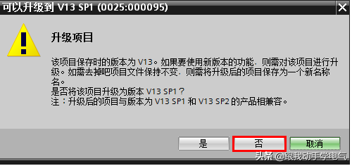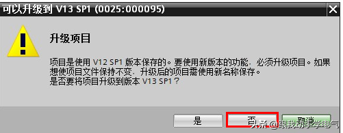 可以从这里下载一个TIAPORTALV12SP1的空项目,然后使用TIAPORTALV13/V13SP1/V13SP2打开该项目时,在弹出对话框选择中间的按钮“否”,这样打开的就是V12SP1的项目,然后就可以使用正常的方式上传。