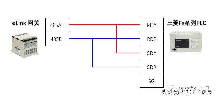 三菱Fx3U32MTPLC与eLinkGW-16网关模块采用485连接,连接如下图所示,即,三菱Fx3U-485ADP-MB的RDA和SDA短接,然后接到eLinkGW-16网关模块的485A+端子;三菱Fx3U-485ADP-MB的RDB和SDB短接,然后接到eLinkGW-16网关模块的485B-。