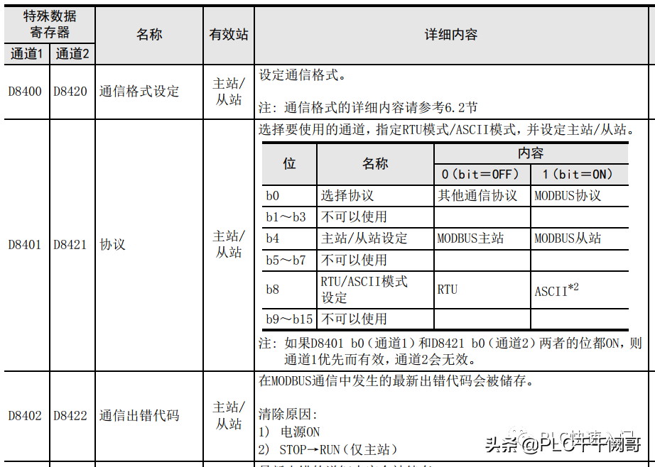 第一步,查询三菱用户手册-MODBUS通信篇,需要设置相关参数,具体含义如下图: