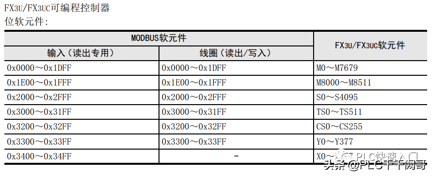 第三步,将修改好的程序下载到PLC中。此时,三菱PLC工作在modbusRTU从站模式下,其内部软元件和Modbus地址的映射关系,查询手册可知,如下图所示: