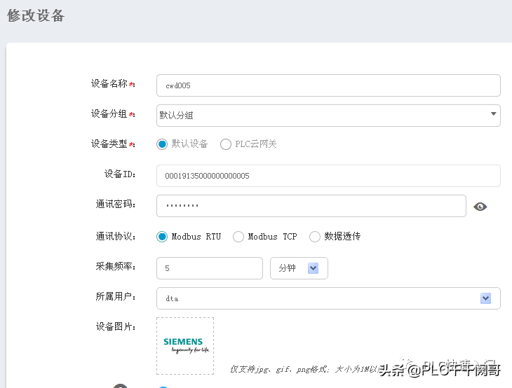 注意:这里可以修改设备名称、采集频率、设备图片,但必须选择ModbusRTU协议。