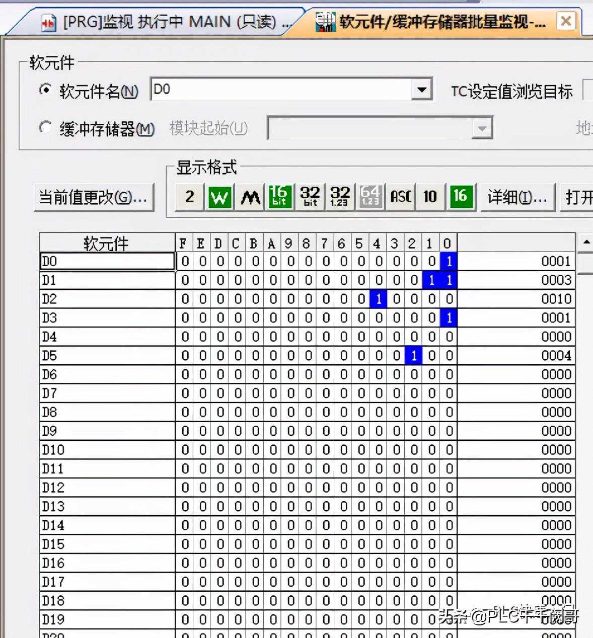 打开三菱PLC的编程软件,将PLC转至在线,从软元件/缓冲存储器批量监视观察数据,如下图: