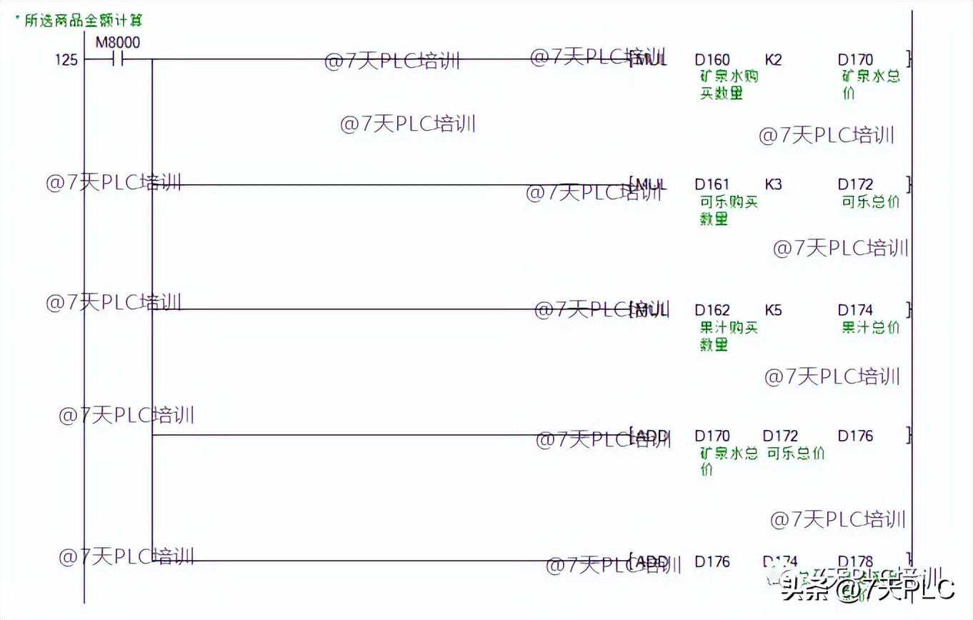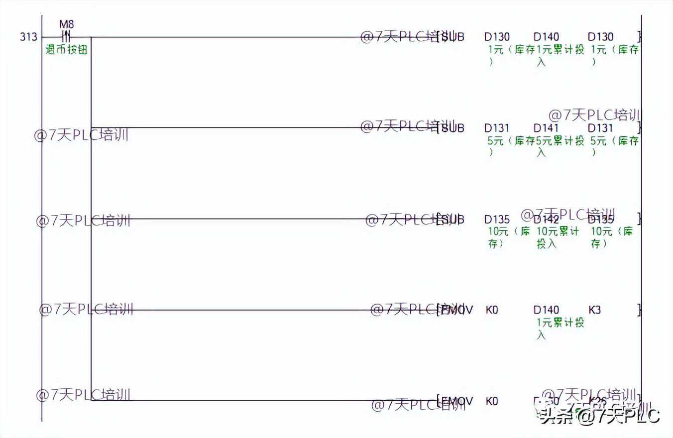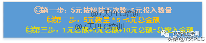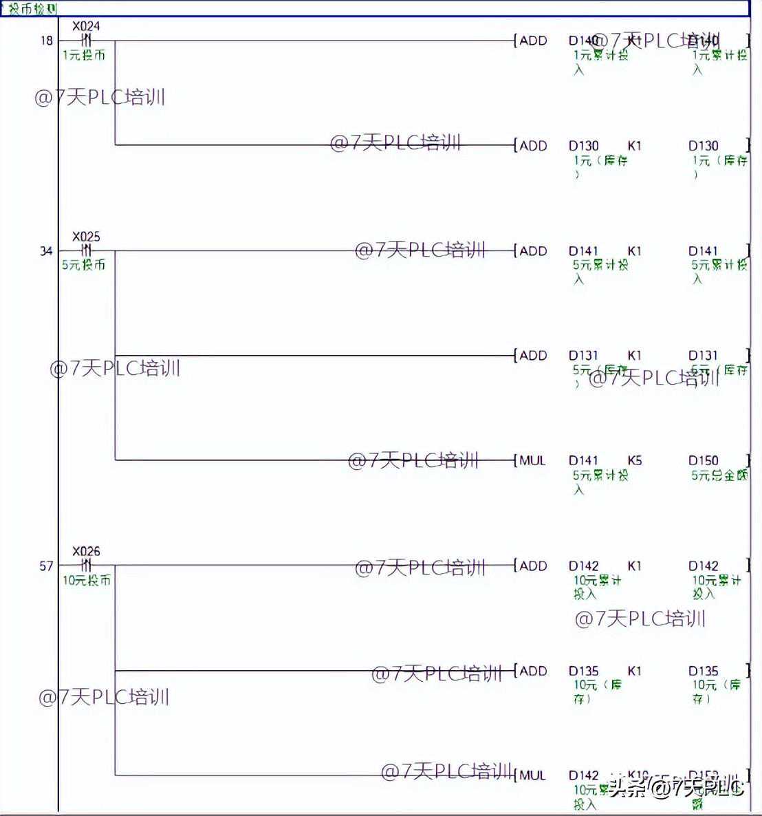 例如5元纸币的模拟投币。我们需要在按钮接通一次的情况下,使用加法(ADD)统计5元纸币的数量,然后使用乘法(MUL)计算5元纸币投入的总额,其他1元/10元纸币也是如此处理,最后将三个纸币的总额依旧使用加法相加即可得出投入的总额: