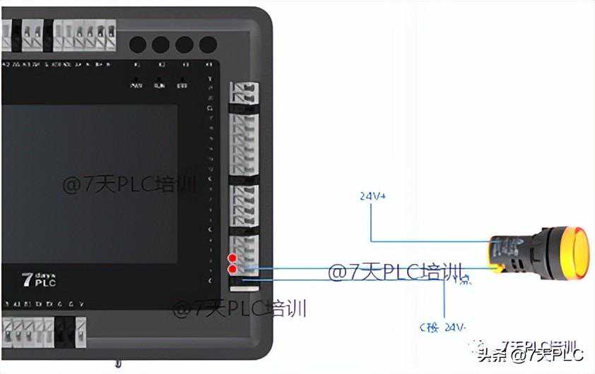 Y1和Y2是晶体管类型,公共端C需要接24V负极,然后将指示灯一端接Y点,因此,输出端接线中红点标识所示,两盏指示灯的另一端口接电源的24V正极即可。