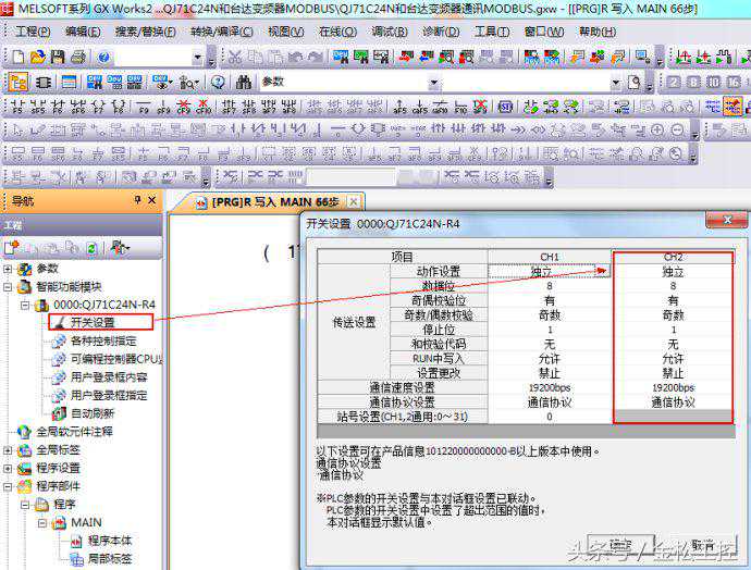 QJ71C24N是三菱Q系列PLC的一个串口通信模块,自带RS232,RS422/485两个通道,并且具备MODBUSRTU主站功能。QJ71C24N做MODBUS通讯主要分三步(其实所有通信都离不开这三步)。第一步:接线。使用通道二RS485口接线,接线方式分为标准2线式和4线式,这里不多说。第二步:参数设置。参数包括模块的参数和变频器参数(也可以是其他支持MODBUS协议的设备,原理一样),两边设置一样,如下图所示: