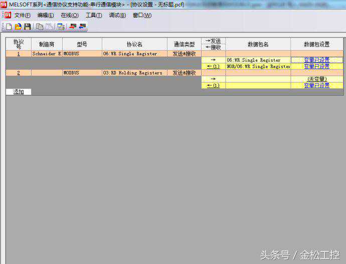 第三步:就是编写程序。这里需要注意一点是,该模块需要先按照MODBUS格式配置协议,然后使用专用指令G(P).CPRTCL发送协议。配置协议使用单独软件,软件包含在编程软件GXWORK2中(工具通信协议支持功能串行通信模块),打开软件按照MODBUS格式来配置协议,如下图: