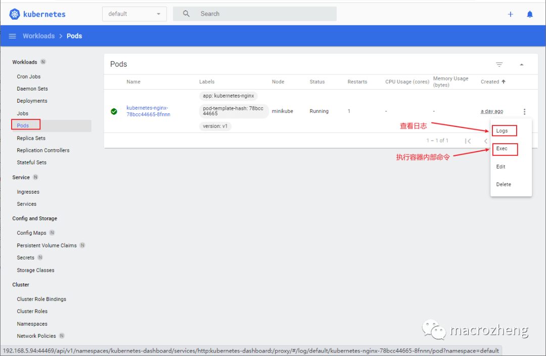 查看K8S中所有Pod的状态信息,通过更多按钮可以查看容器日志和执行内部命令。