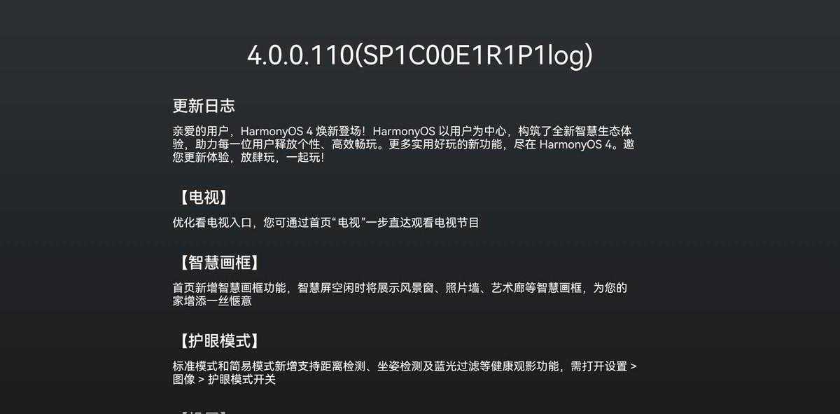 通过以上升级内容可以看出,这次版本更新从操作流畅度、健康关怀和家庭娱乐氛围几个维度入手,持续完善智慧屏的功能体系,为用户提供更丰富、更智能和更人性化的产品体验,这充分彰显了华为“以人为本”的设计理念。