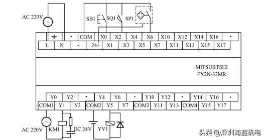 FX2N-32MR型为例,在PLC的输入端接入一个按钮、一个限位开关,还有一个接近开关;输出为一个220V的交流接触器和一个电磁阀。