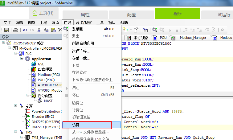 开启仿真的方法,在菜单【在线】中选择【仿真】,操作如图2所示。