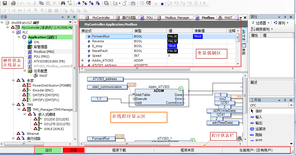 程序编写部分在线后成为在线程序显示区,程序中的布尔变量会显示运行时的实际值,例如True或false,数值型变量或枚举型变量会显示当前值,例如程序中的枚举型变量mw2显示MW,如图5所示。