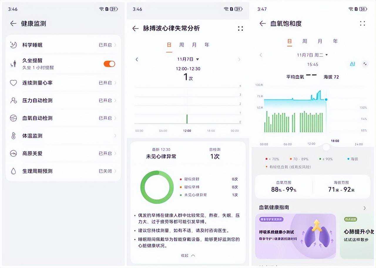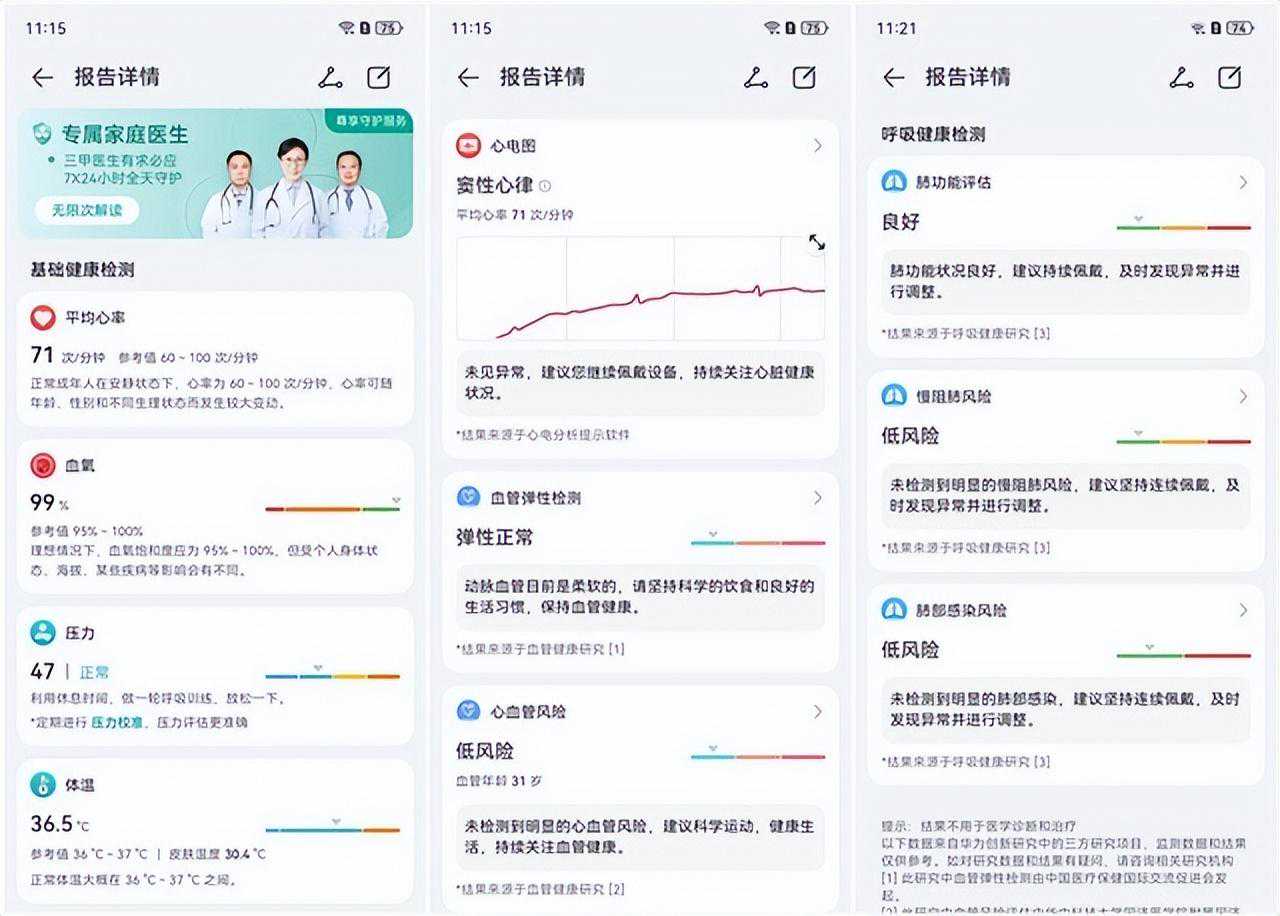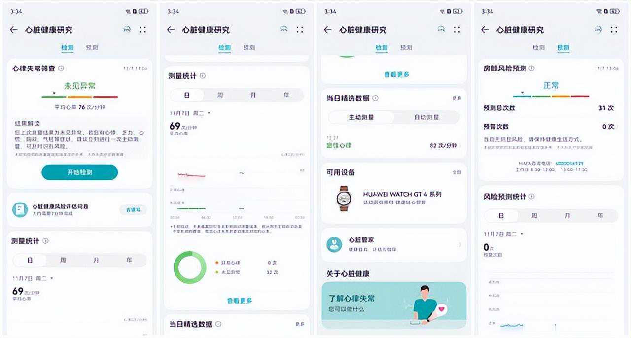 关于心脏健康研究和血管健康研究,这两项服务也是华为联合国内权威医院和机构发起的。其中心脏健康研究支持心律失常筛查、24小时智能监测,实现了房颤、早搏、未见异常等精细化分类识别。尤其是对于有相关病史的人群来说,这是一个非常实用的预警功能。