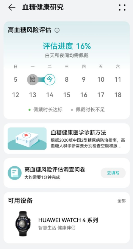 HUAWEIWATCH4系列就提供了高血糖风险预警的功能,该功能可以让你在正常佩戴手表的情况下,开启血糖健康研究功能,无需其他操作,仅需7-14天时间(白天至少佩戴2小时,夜间至少佩戴4小时),就可以帮你评估你的高血糖风险系数。