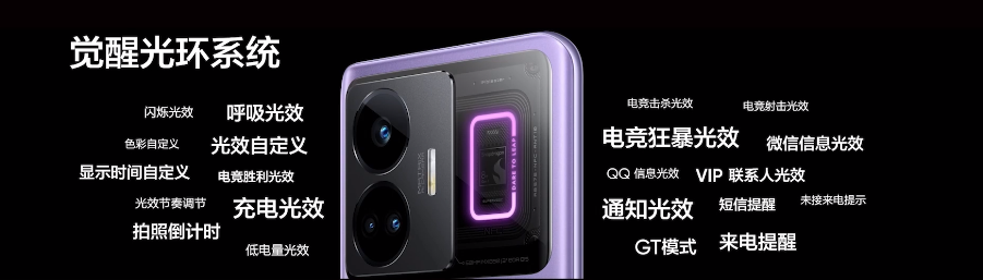值得一提的是,这个觉醒光环系统,除了常规的消息提醒、来电提醒,创新的系统级适配在闪充时可以根据不同电量情况亮起不同颜色光效,甚至连打游戏时也可以拥有专属的灯光效果。
