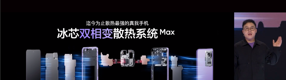 散热方面,真我GTNeo5带来了冰芯双相变散热系统Max,拥有6580mm²行业最大石墨烯微腔相变均温板和4500mm²真我最大3D钢化VC液冷散热。