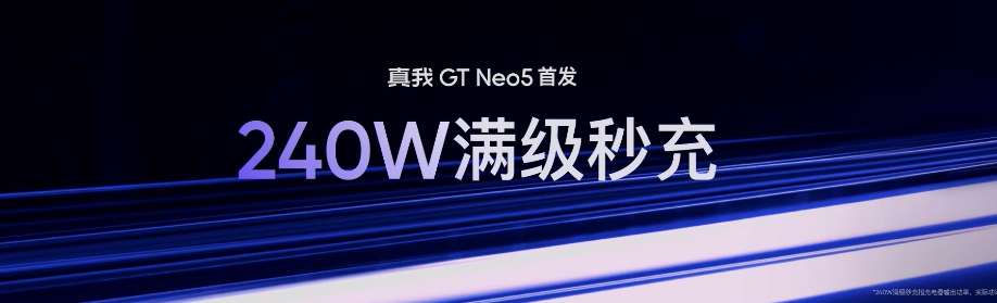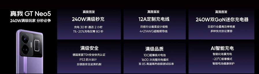 紧接着就是续航方面,关于150W这个技术咱们已经在去年的真我GTNeo3见证过了,这次真我GTNeo5带来了目前C口支持最高的240W快充功率。