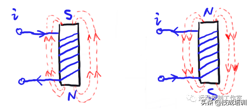将导线绕成一个线圈,通入电流即可以构成一个电磁铁。线圈中加入铁心,磁场会变得很强。磁通线产生一个N磁极,一个S磁极。N极和S极的方向由电流方向决定(右手定则,是否忘了?不过不重要,反正不用参加高考了),如图5所示: