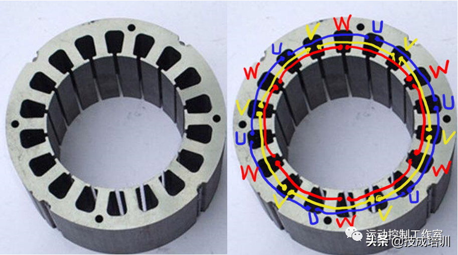 嵌入线圈前的定子铁心如左图,U、V、W三相绕组按右图插入定子齿槽。UVW三相分别用蓝,黄,红色表示。