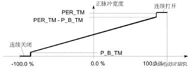 正脉冲宽度和负脉冲宽度可以根据输入变量(单位[%])和周期时间相乘进行计算。脉冲周期=INV/100xPER_TM