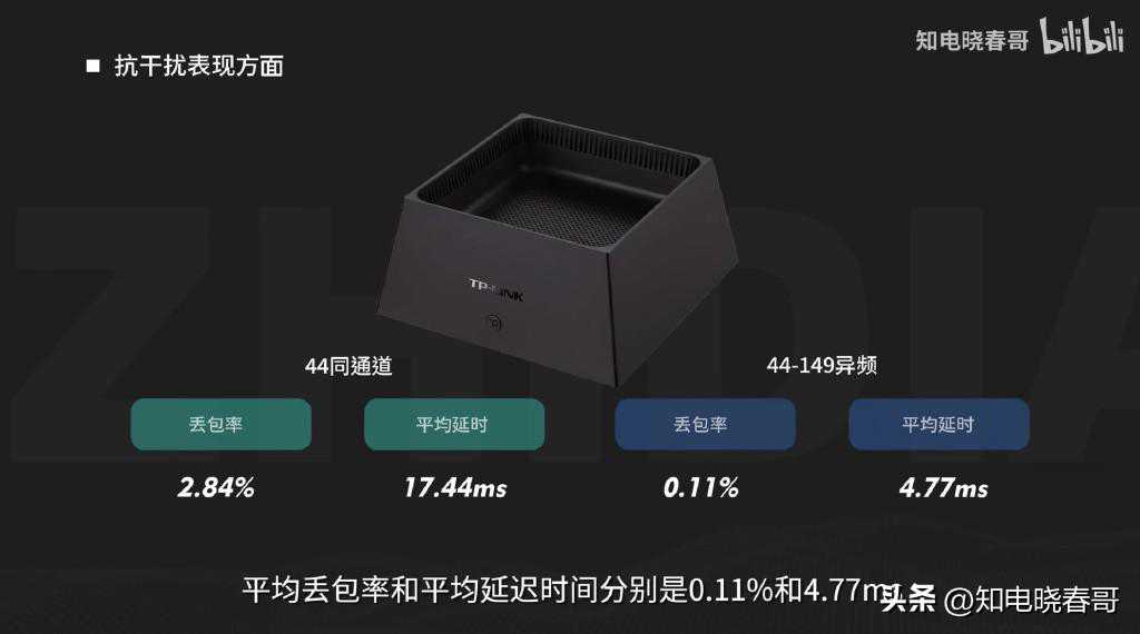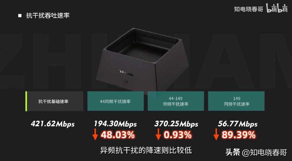 来看抗干扰的数据总结,同频干扰的降速,分别是44信道的48.03%和149信道的89.39%,而异频抗干扰的降速则很低,为0.93%。