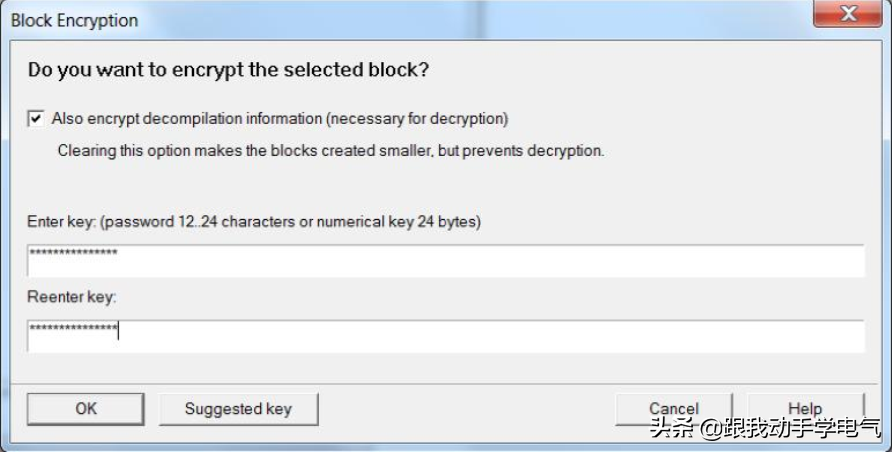 在SIMATICManager中选中块文件夹后在主菜单中选择“OptionsBlockPrivacy”(或者右键单击块文件夹在弹出菜单中选择“BlockPrivacy”)。选择后会打开“S7-BlockPrivacy”的对话窗口。在窗口中列出了所有可以通过“S7-BlockPrivacy”程序加密的功能块。右键单击需要加密的功能块FB1(如图1-1所示),在弹出的菜单中选择“EncryptBlock…”。选择后打开了“BlockEncryption”的对话窗口。在“BlockEncryption”对话窗口的“Enterkey”字段中输入至少12个字符密码,在“Reenterkey”字段中再次输入密码,如图1-2所示。输入密码后单击“OK”,在弹出的提示信息对话框中再次单击“OK”,到此就完成了对程序块的加密保护。被加密的块将被标记成红色和一个锁图标如图1-3所示。