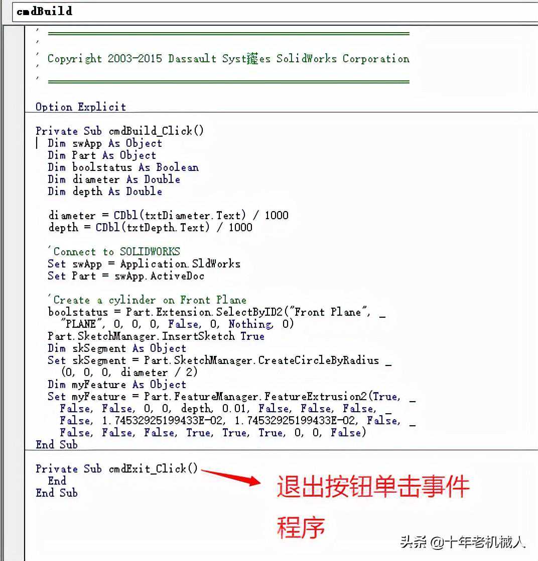 PrivateSubcmdBuild_Click()DimswAppAsObjectDimPartAsObjectDimboolstatusAsBooleanDimdiameterAsDoubleDimdepthAsDoublediameter=CDbl()/1000depth=CDbl()/1000'ConnecttoSOLIDWORKSSetswApp=='CreateacylinderonFrontPlaneboolstatus=("FrontPlane",_"PLANE",0,0,0,False,0,Nothing,0)=_(0,0,0,diameter/2)DimmyFeatureAsObjectSetmyFeature=(True,_False,False,0,0,depth,0.01,False,False,False,_False,1.74532925199433E-02,1.74532925199433E-02,False,_False,False,False,True,True,True,0,0,False)Sub