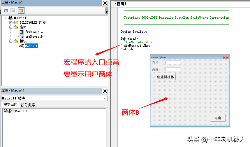 如何根据使用者的要求,自动生成我们想要的模型或功能,例如:不同长度,不同高度的圆柱体,这个时候就要借助添加用户窗体的功能,让用户自行输入圆直径和高度,使用户可以和宏进行交互。