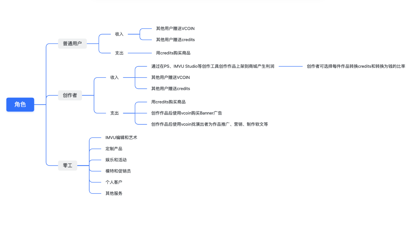 IMVU市场角色主要分为三种:普通用户、零工、创作者。