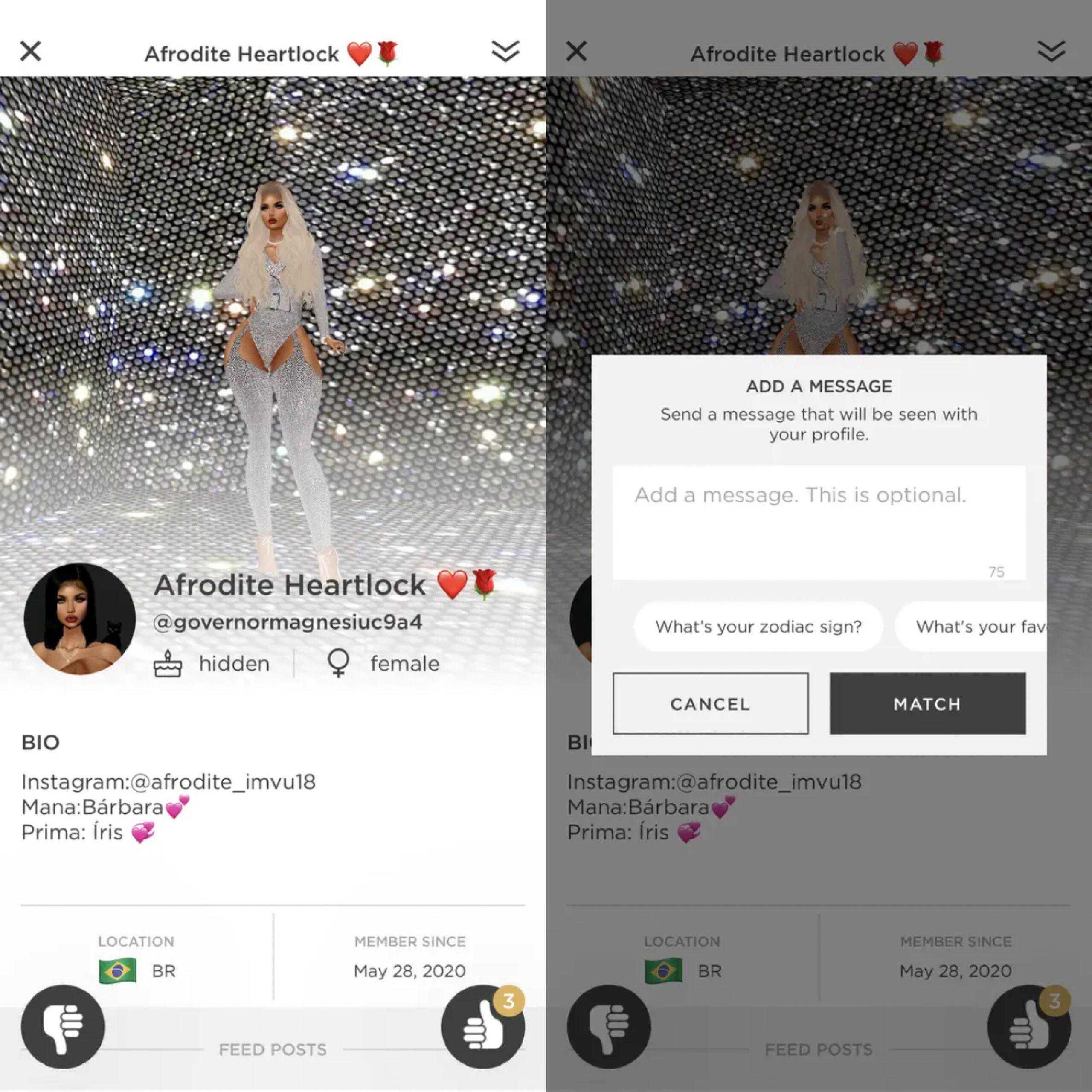 所以划卡匹配应运而生,IMVU的划卡采用了类Tinder的划卡交互,让用户将筛选点聚焦在对方的虚拟形象和Post上。