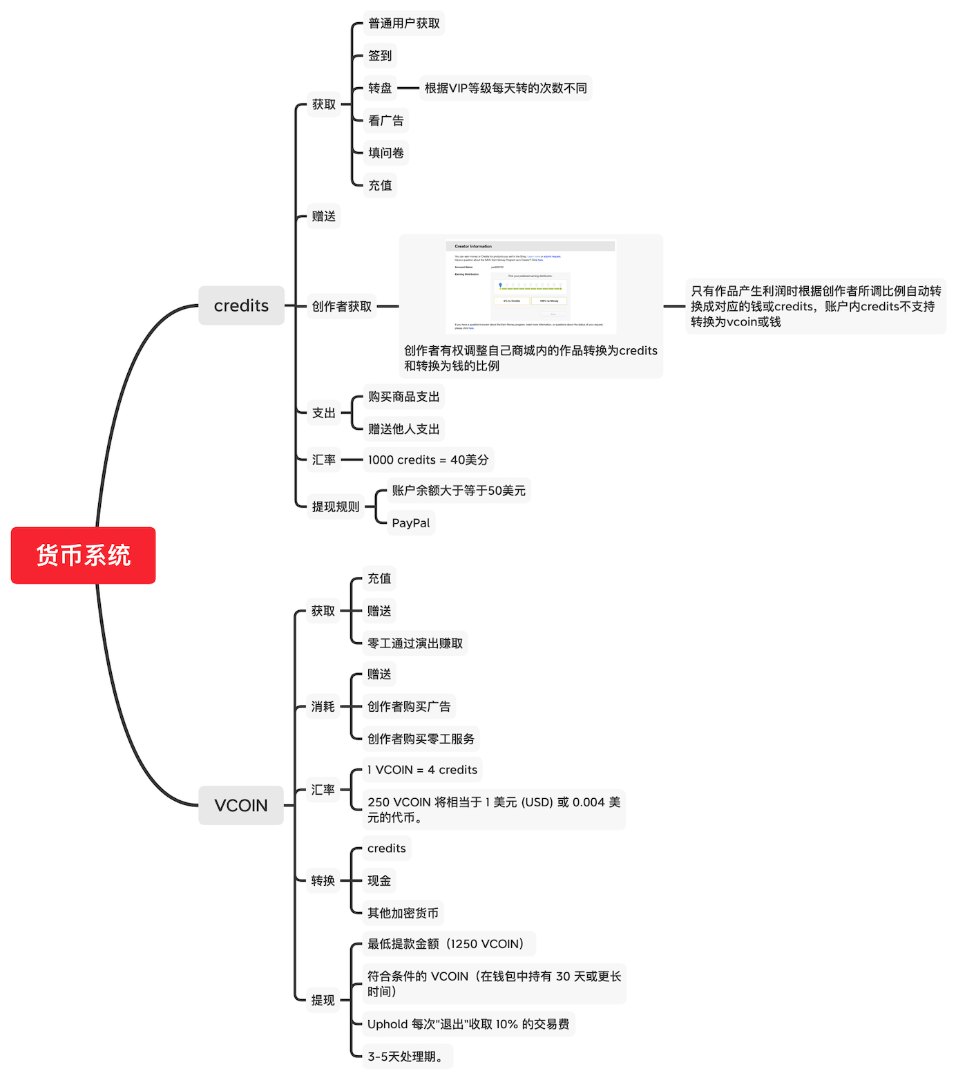 上图汇总了IMVU内的货币系统,C币主要作为商城流通的交易货币,VCOIN主要作为商业零工的交易货币。创作者可以自由调节每一笔交易额中自动转换为C币和钱的比例,用于销售商品获得的C币才可转换。VCOIN支持转换为现金、C币或其他加密货币。