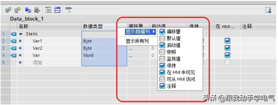 如果数据块时选择“标准-与S7-300/400兼容”,则在数据块中可以看到“偏移量”列,并且系统在编译之后在该列生成每个变量的地址偏移量。设置成优化访问的数据块则无此列。