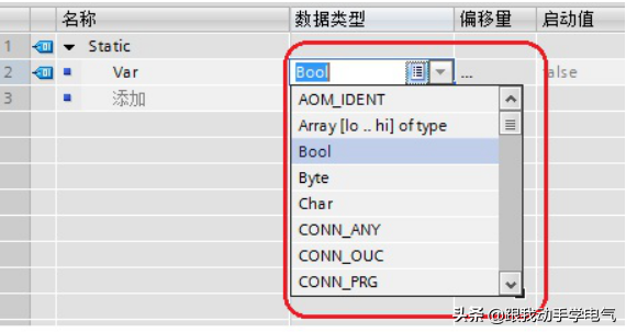 定义变量的数据类型:可以为变量定义基本数据类型,复杂数据类型(时间与日期,字符串,结构体,数组等),PLC数据类型(如用户自定义数据类型),系统数据类型和硬件数据类型。可以直接键入数据类型标识符,或者通过该列中的选择按钮选择。如下图所示: