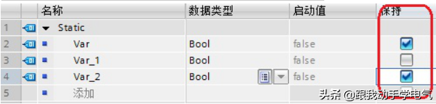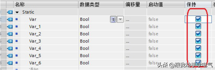 DB块数据的保持性:对于可优化访问的数据块,其中的每个变量可以分别设置其保持与否;而标准数据块仅可设置其中所有的变量保持或不保持,不能对每个变量单独设置。如图7和图8所示: