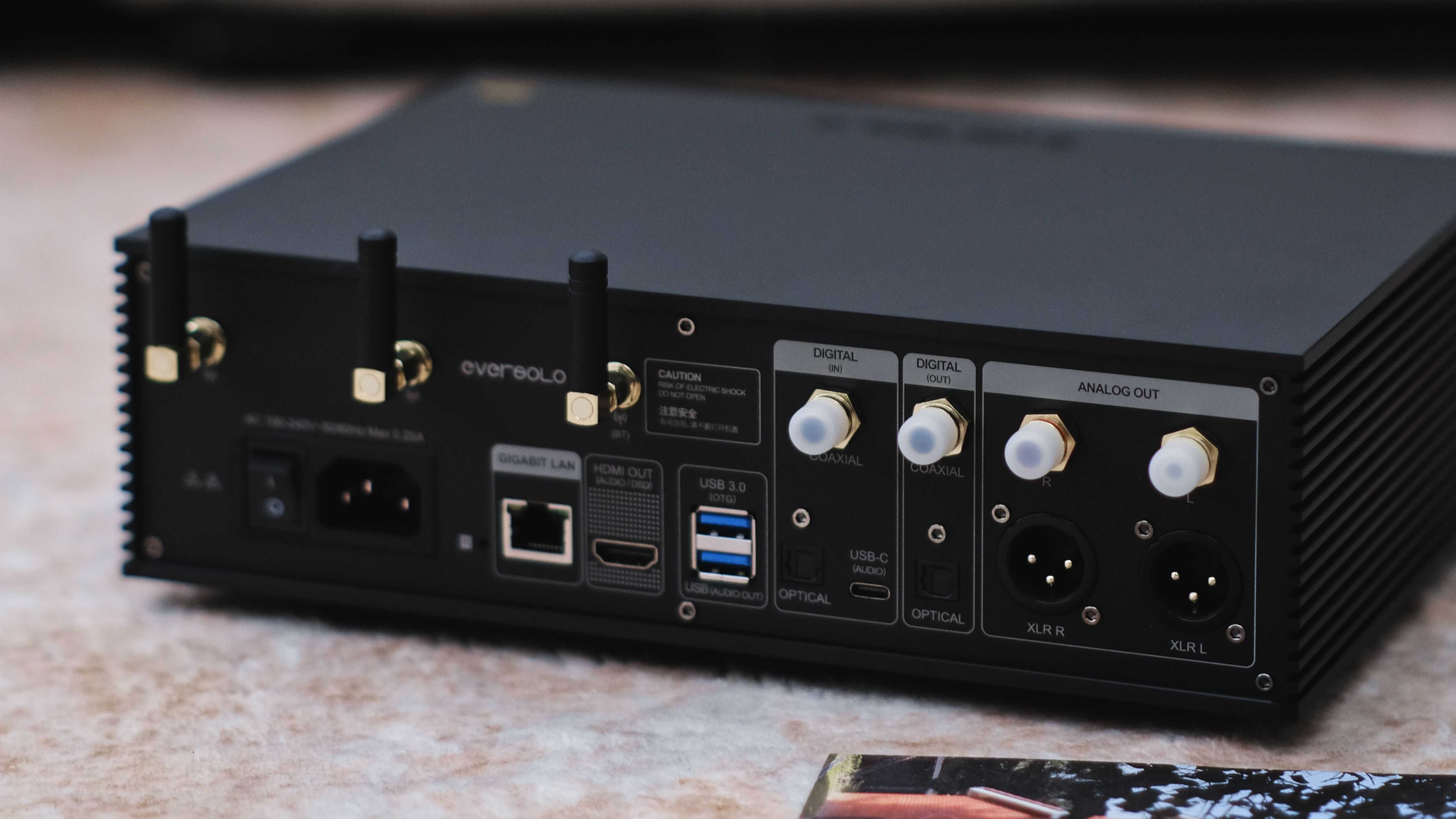 来到艾索洛DMP-A6机身的后部,作为一款专业的数播解码一体机,它的输入、输出接口非常丰富,包括有模拟输出部分、数字输出部分、数字输入部分、USB接口、HDMI接口、网络接口。