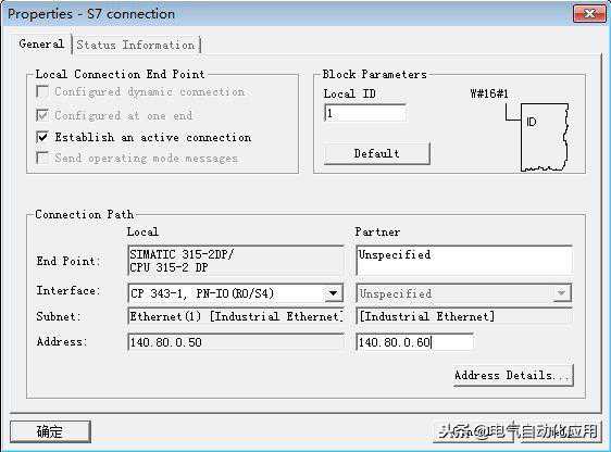 在“AddressDetails”对话框中,本地的TSAP通常选用默认,输入通信伙伴的TSAP,本例中S7-200的TSAP为12.00。