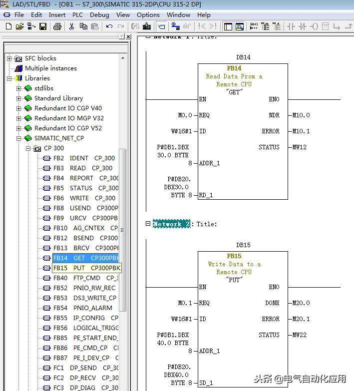 需要在S7-300程序中,调用功能块FB14“GET”和FB15“PUT”。可以在StandardLibrary--CommunicationBlocks--Blocks下找到这些功能块。