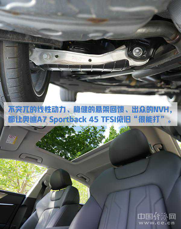 记者本次试驾的45TFSI车型搭载的是2.0T高功率发动机,最大功率为195千瓦,最大扭矩为370牛·米。实际驾驶中,虽难能感受3.0T车型的暴力美学,但也依旧从容,甚至还多了份细腻,毫不突兀的线性动力输出、滤过性成熟稳健的悬架回馈,以及出众的NVH,都让奥迪A7Sportback45TFSI的驾乘体验依旧“很能打”。(图/文中国经济网记者郭跃)