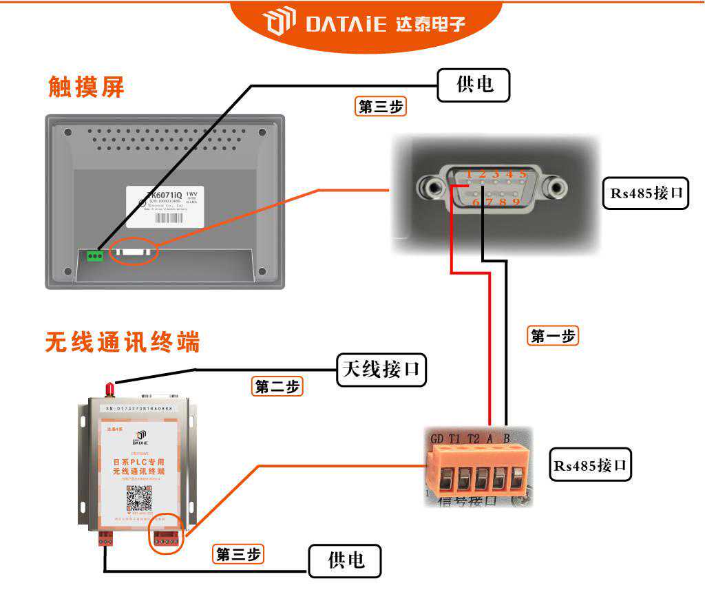 第三步:全部接线结束后,分别给触摸屏与无线通讯终端供电