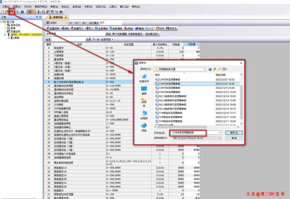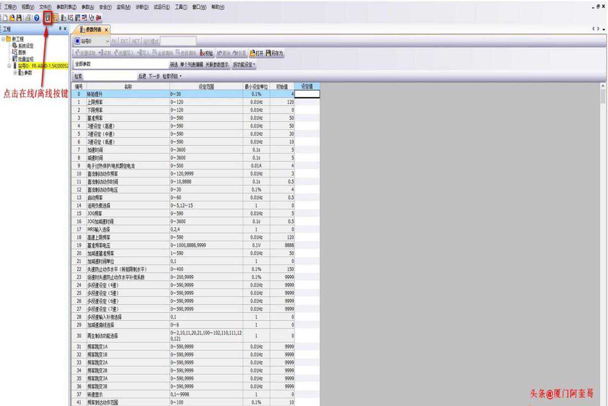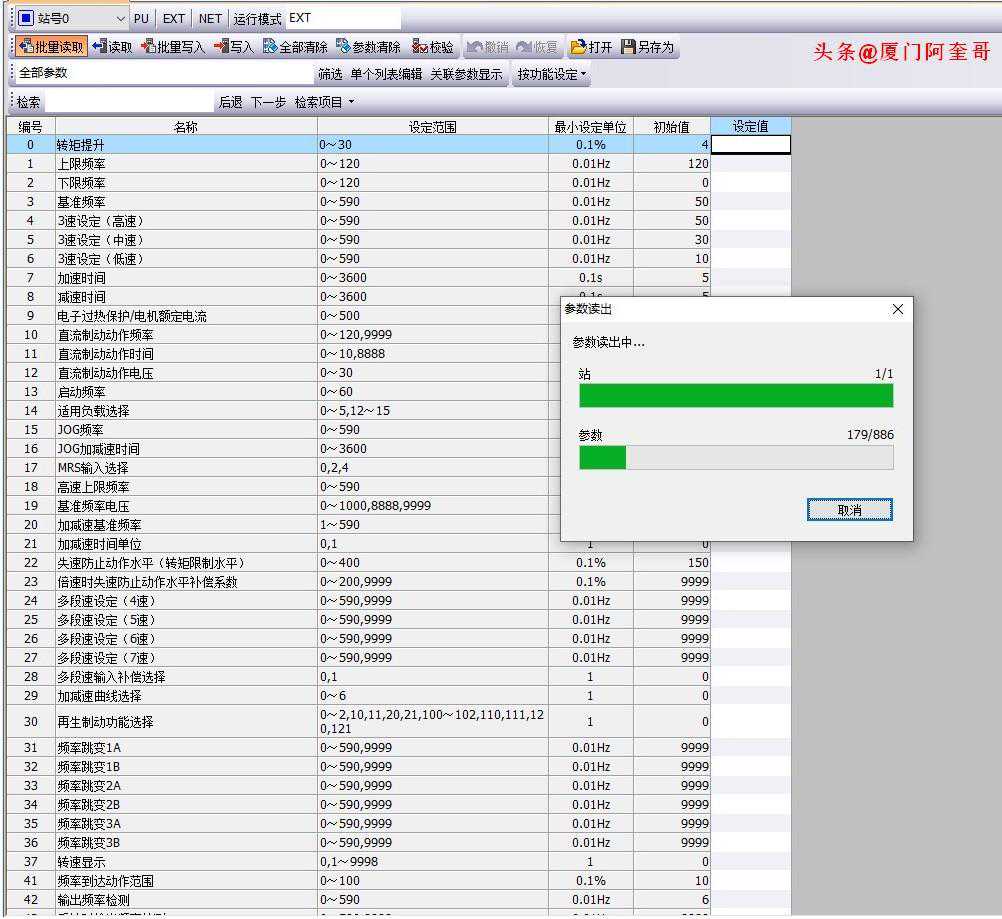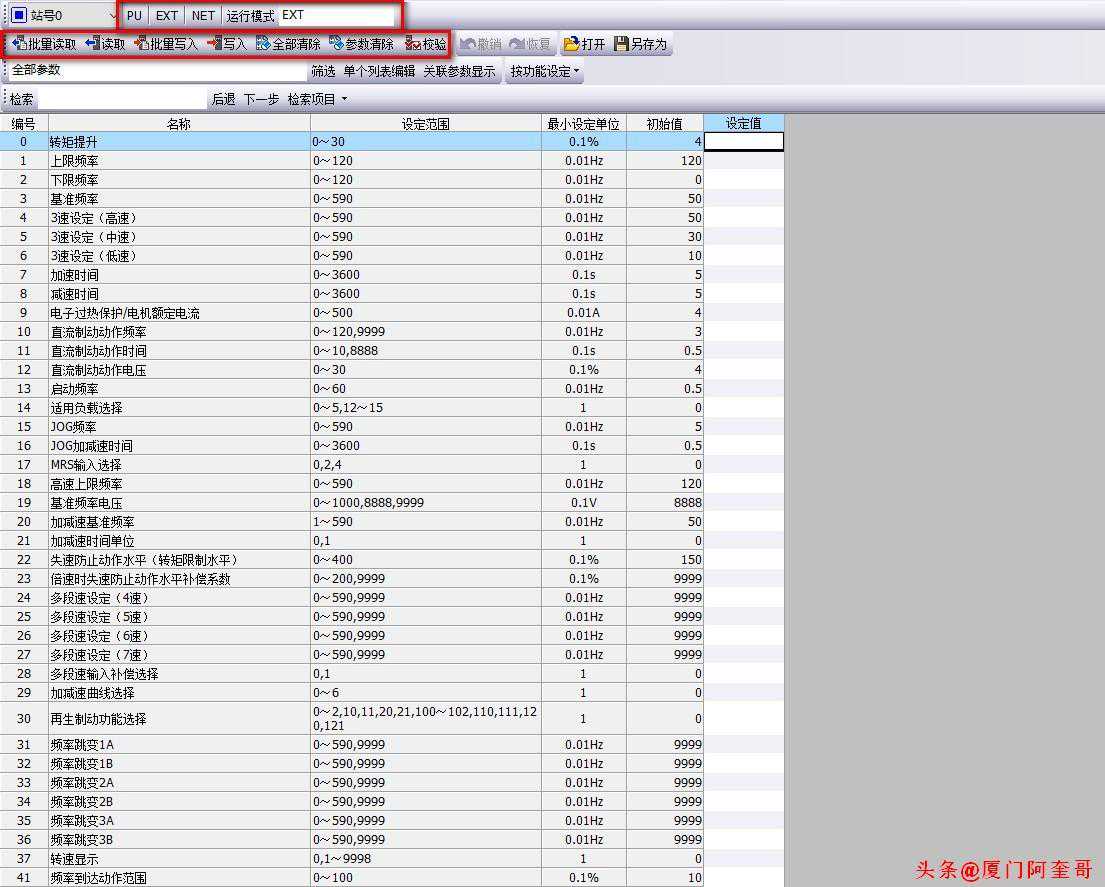 如下图所示:在设定值处就是变频器读出来的参数内容,黑色字体的参数是未更改过的,如果是蓝色字体代表参数有修改过。