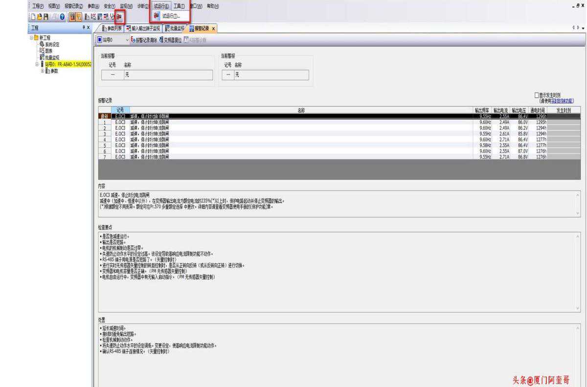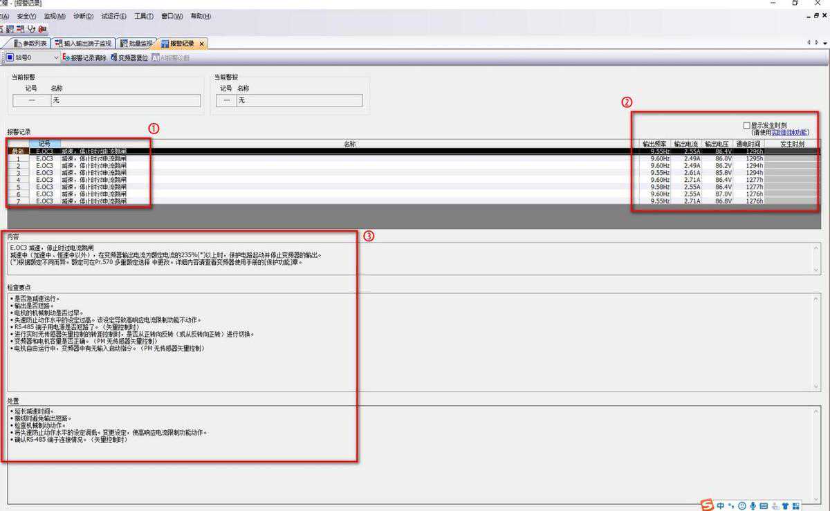 报警记录:查询变频器的历史故障代码、报警时间、内容、检查要点、及如何处理故障方法。