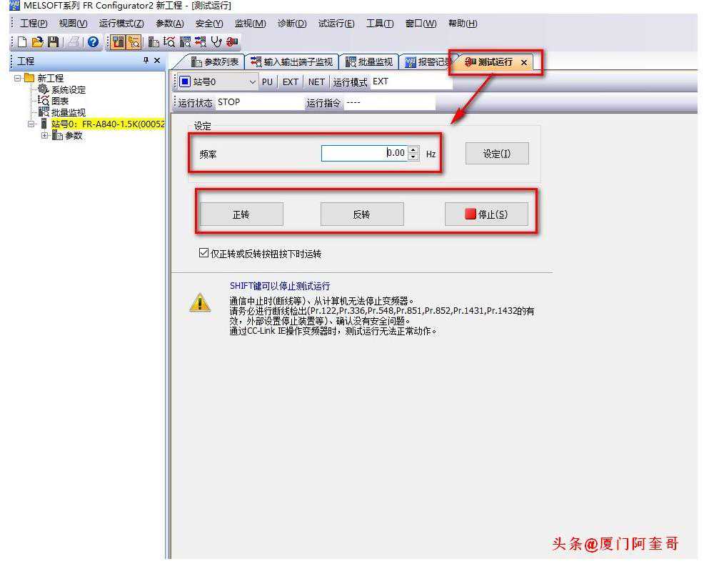 (4)试运行:可在软件上对变频器进行正反转操作。